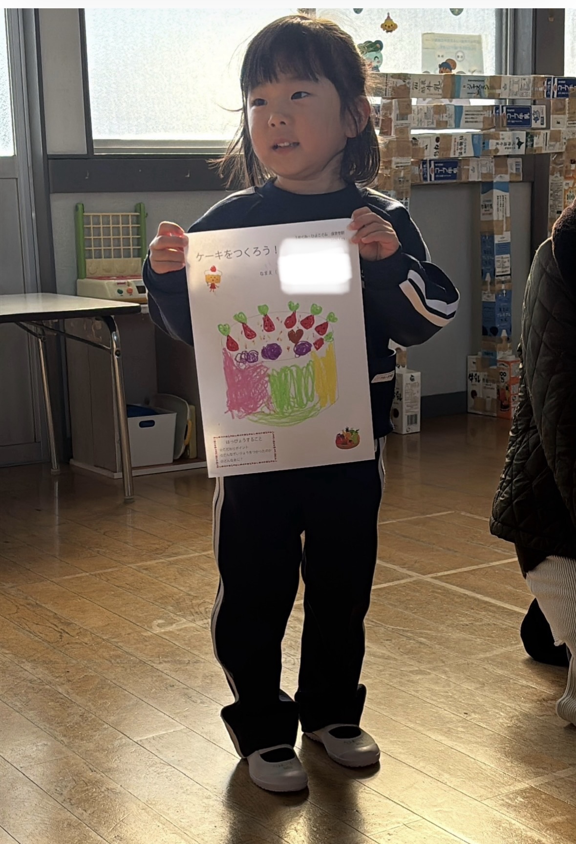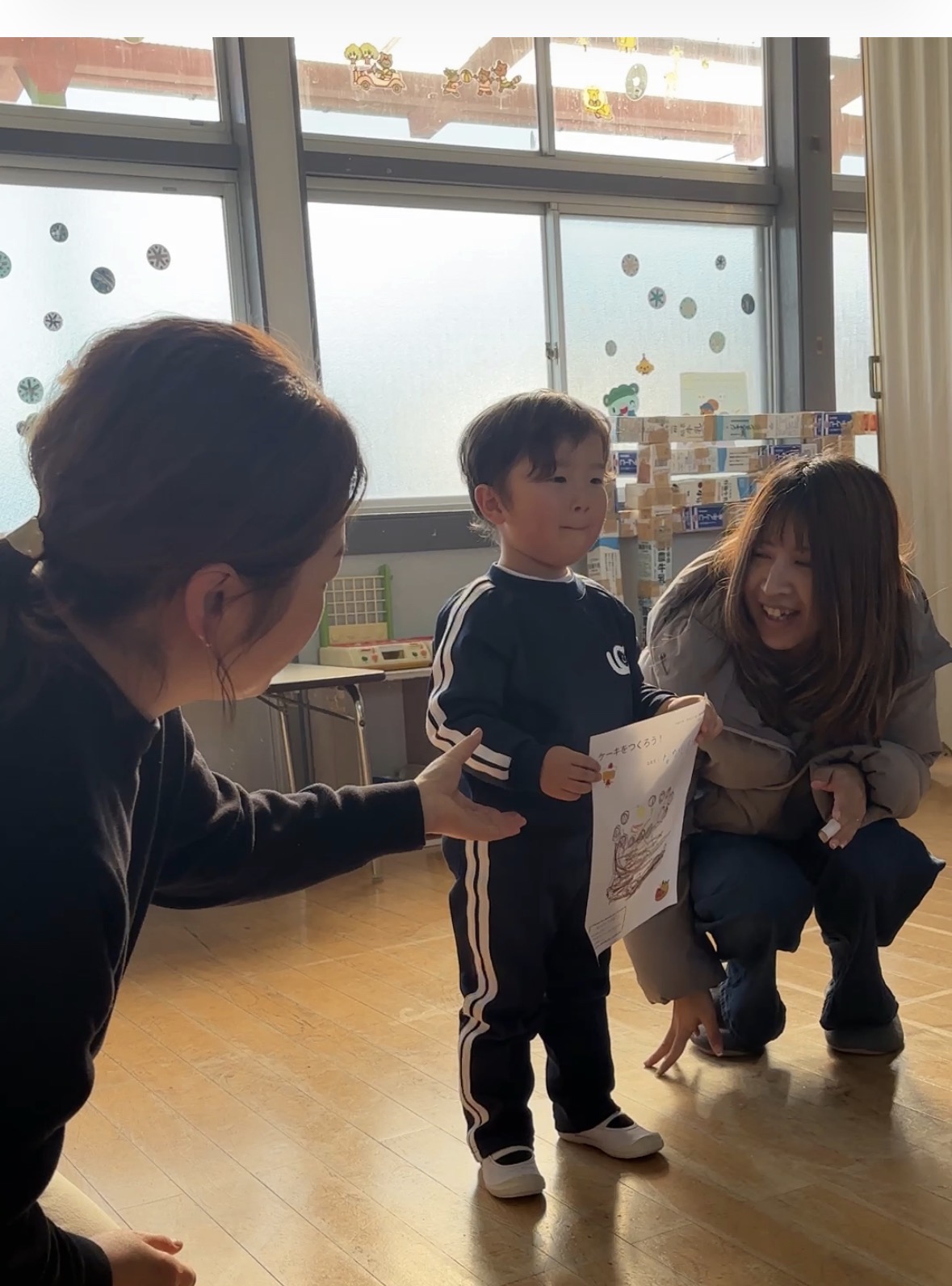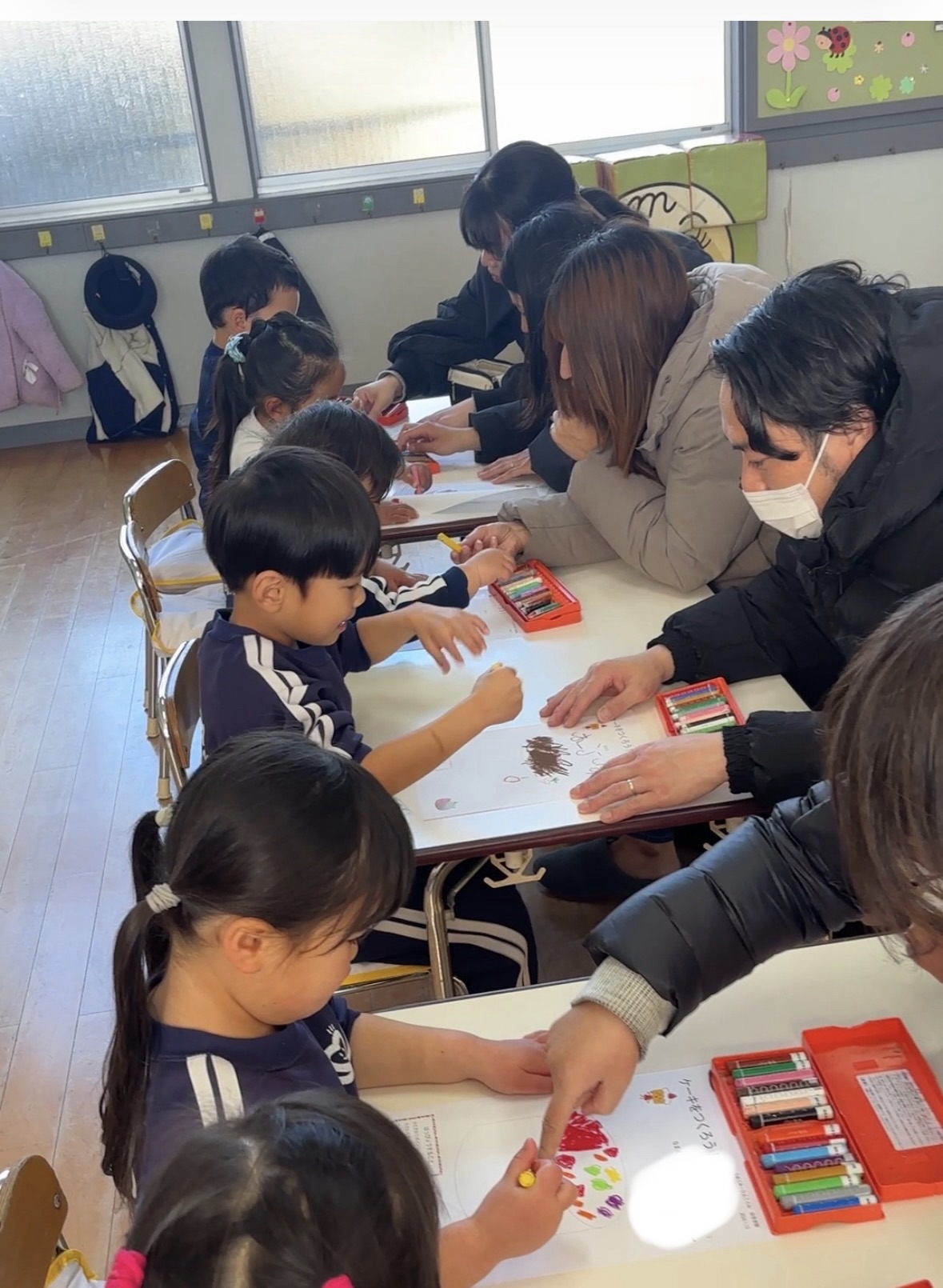 その後、あやこ先生が用意してくれたプリントにどんなケーキが作りたいかを親子で話し合ってデザインし、みんなの前で発表しました。