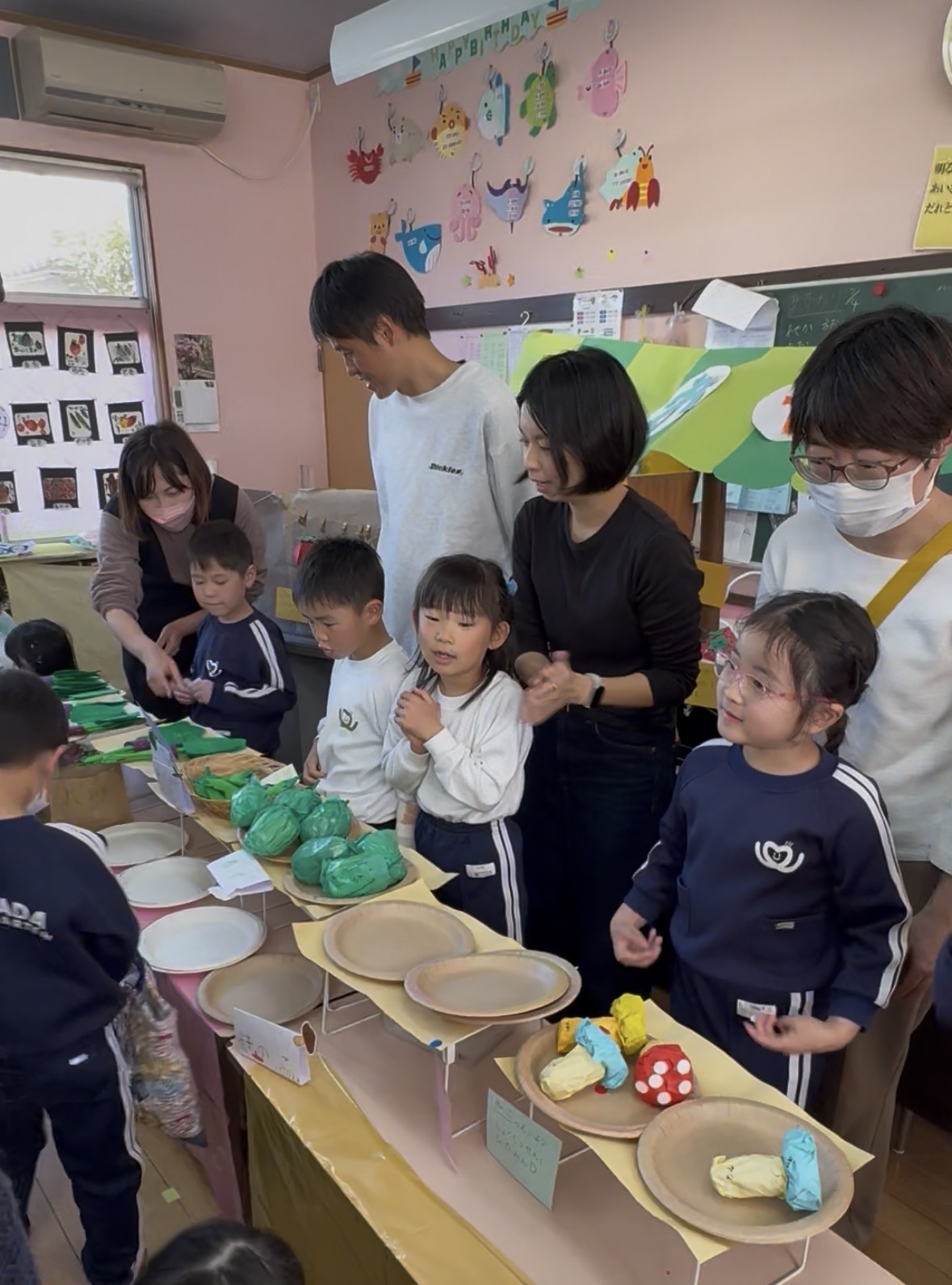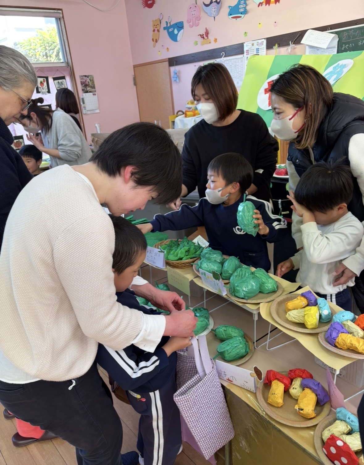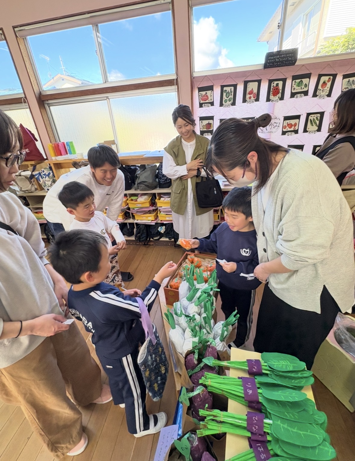 さくら えいごあそび保育参観 2026-03-04 最終更新日時 : 2026-03-04 postuser さくらさんのえいごあそび参観がありました~ 思い出会の作品を利用してお店屋さんごっこを英語で行いました! おうちの方と一緒に『May I help You?』と声をかけ欲しい品物を言ってお金を渡すやり取りをしました。おうちの方と楽しみながらお買い物ができました〜