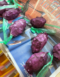 さくらさんは年間テーマ製作で、秋の旬さつまもを作りました。 新聞紙でさつまいもの形にした物にちぎった和紙をはり、絵の具で塗りました。 美味しそうなさつまいもが出来ました!