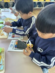 七五三のお参りに向けて袋作り!! ももさんは、年間テーマ「はたらくくるま」でも 勉強した「消防車」の袋を作りました! さくらさんは鶴の袋を作りました! 「七五三」の字も書きました✨ 金曜日のお参りで持って行きます!