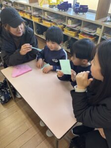 今日からさくらぐみさん、 2回目のお茶会がはじまりました! 2回目はようかんを頂きます。 手の上において、ようじで食べたそうです! 次回は来週〜!お楽しみに!